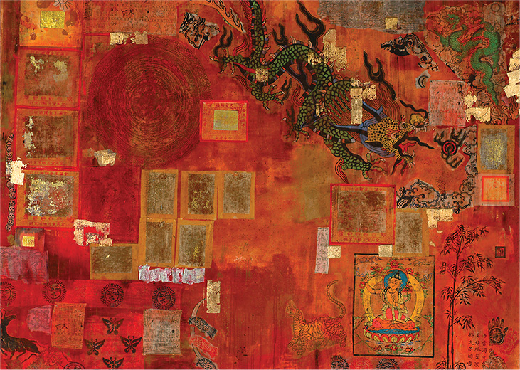 A chronicle of the artist’s Eastern wanderings, possibly inspired by a hidden hermitage lost in the shadowy feet of the Himalayas, ‘Lu’ is an eclectic anthology of Chinese, Indian and Tibetan images in antique reds and faded gradients of yellow ochre. Cryptically deployed metaphors of Eastern mythology curiously combine with squares of gold - the same shimmering gold leaf applied by pilgrims on devotional icons throughout Asia - arranged within an ordered sequence across a mysterious surface.